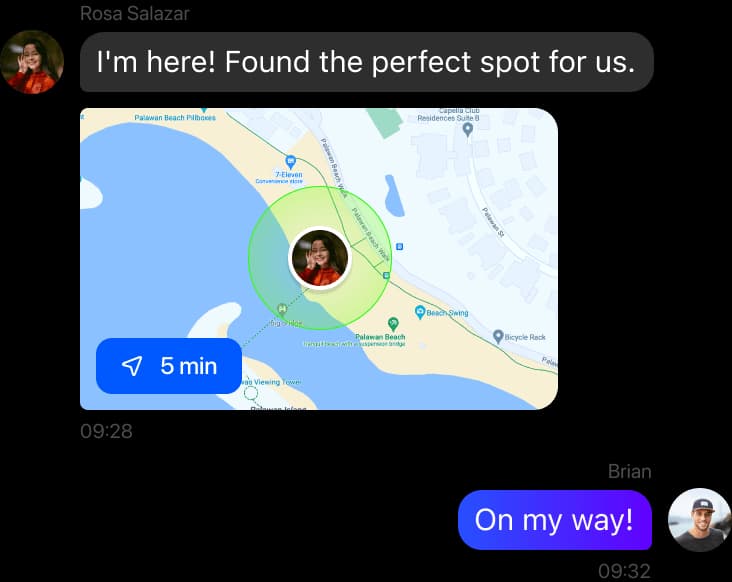 Share your location or request a friend’s location from the plus button. When someone shares a location with you, view it directly within your conversation.