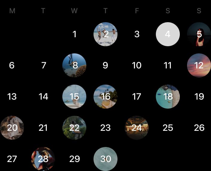 To quickly find media from a specific time, tap on the date bar to open a calendar interface with media previews for each day.
